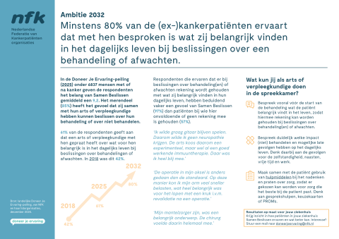 Op basis van de ingezette stijgende lijn in Samen Beslissen is het de ambitie van NFK dat in 2032 minstens 80% van de (ex-)kankerpatiënten ervaart dat zorgverleners met hen besproken hebben wat zij belangrijk vinden in het dagelijks leven bij beslissingen over behandeling of afwachten. NFK roept zorgverleners dan ook op om deze lijn voort te zetten en verdieping toe te passen.