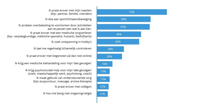 Opvallend zijn de uitkomsten wat betreft werk. (Ex-)kankerpatiënten voelen zich door de ‘late gevolgen’ beperkt op hun werk. Ook wordt er weinig begrip ervaren vanuit het werk. Werkgevers en bedrijfsartsen dienen hier alert op te zijn. Lees bij het thema kanker en werk meer over 'late gevolgen' op de werkvloer:
